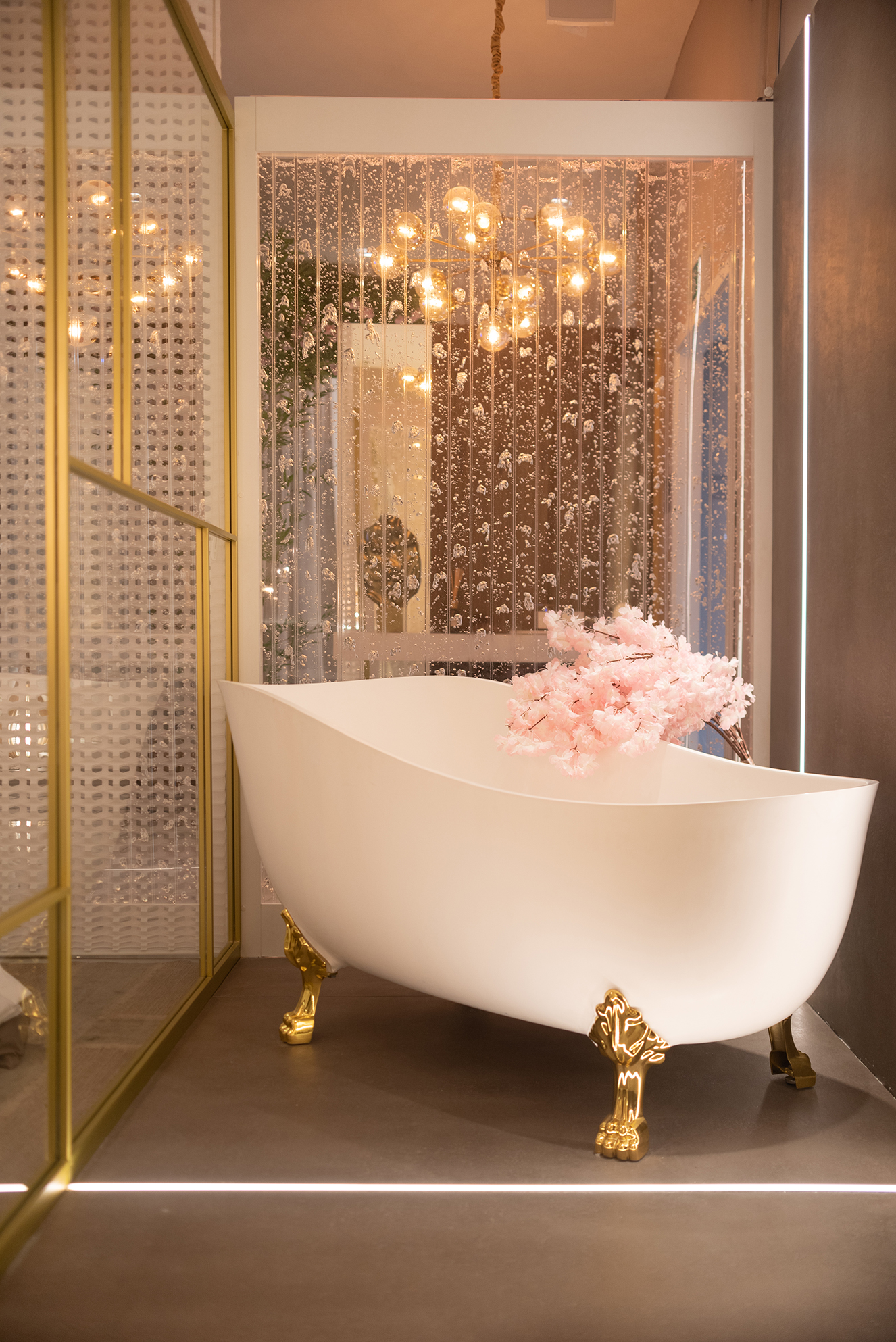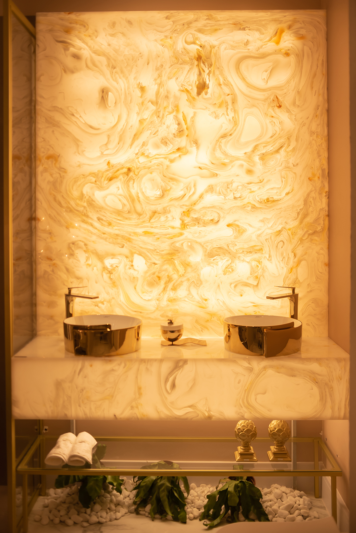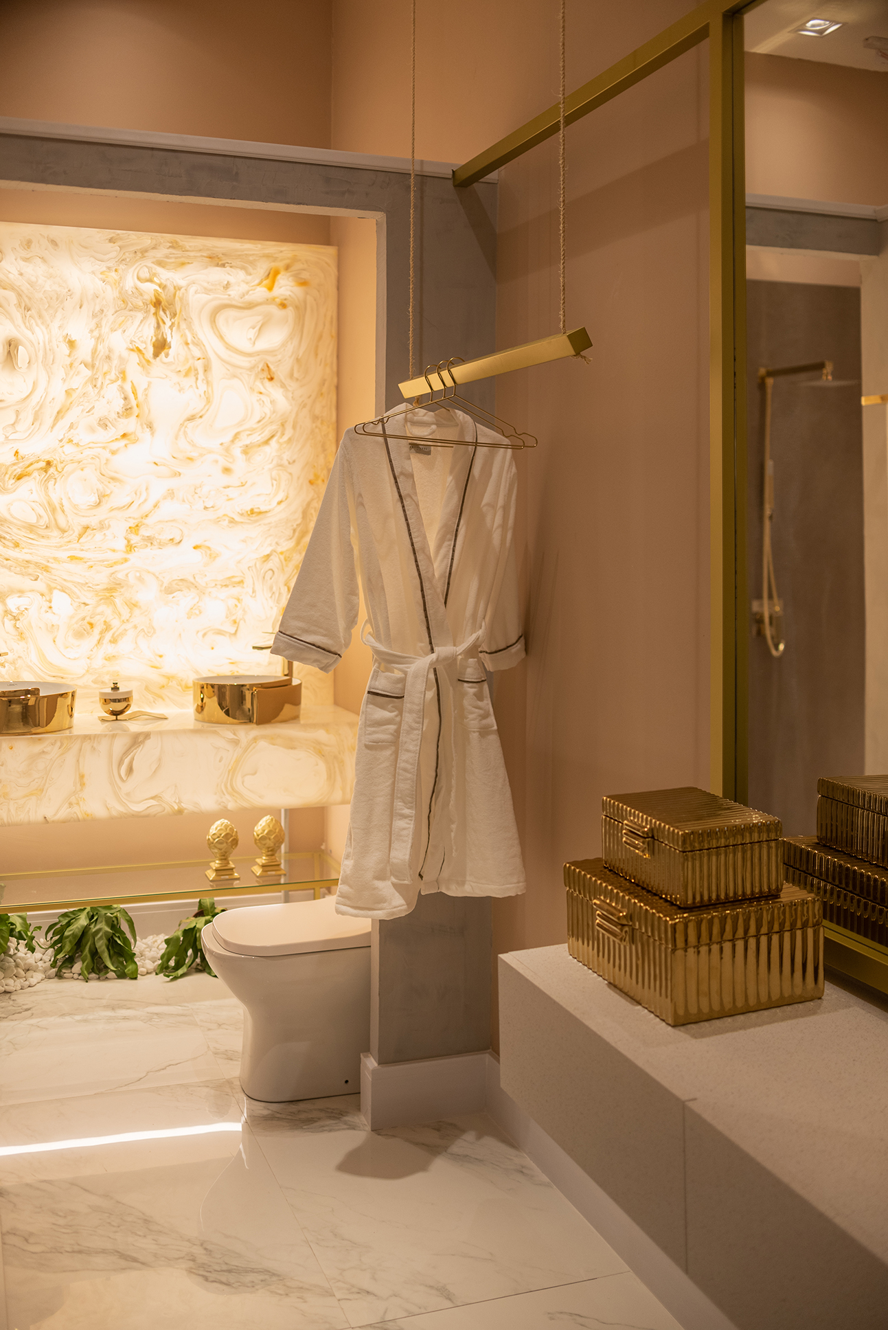 O luxo impera no banheiro com um Ônix retroiluminado, proporcionando uma luz incrível. Também foi utilizado a lastra para conferir um aspecto muito mais natural, com textura acetinada e nas tonalidades escura e marrom. O toque do dourado evidencia a sofisticação do ambiente nos metalons, metais, cuba e luminárias.