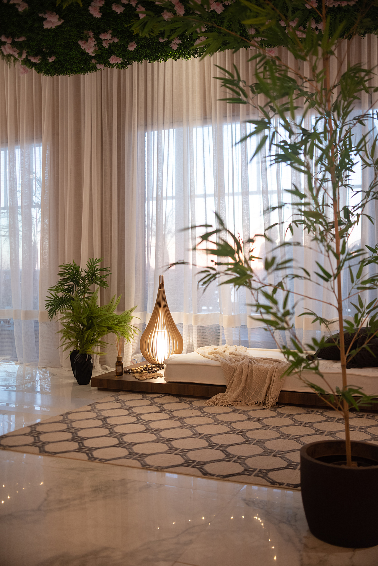 A provocação para reforçar a conexão com a natureza se dá por conta do painel de bolhas, logo na entrada, remetendo o elemento água como energia; um jardim suspenso no teto; um quadro, desenvolvido pela arquiteta, da flor de cerejeira brotando em meio às pedras, demonstrando a resiliência; pelo cimento queimado (símbolo ao urbano); pelo 3D cimentício surma colocado na parede de maneira irregular com paginação diferenciada, e pelas prateleiras desenvolvidas para compor o espaço de onde brotam as plantas.