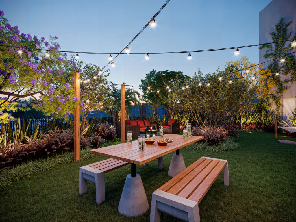 No térreo, os moradores terão acesso à piscina, espaço fitness, brinquedoteca, playground e pet wash. O rooftop, por sua vez, foi idealizado para o convívio e a celebração, com espaço gourmet externo, lareira (fireplace), salão de festas e lounges para relaxar e apreciar a vista. Já o jardim “secreto” se sobressai por ser um espaço de contemplação e bem-estar, onde redário, chimarródromo e área para piquenique ficam entre as árvores nativas. Além de ser uma área onde pisar na grama e colher temperos na horta conferem a sensação de estar no quintal de casa.