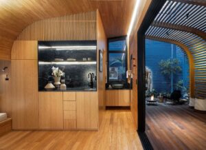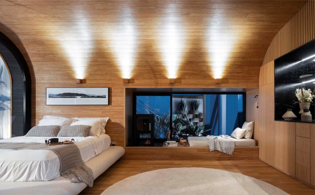 – Para nós foi incrível conhecer os atributos do material em comparação às madeiras convencionais que estamos acostumando a trabalhar. O material é estável, bonito, cheiroso e resistente. A gente inclusive colocou uma TV de 65 polegadas nele. Também respondeu a tudo que a gente buscava: estética, beleza, resistência, praticidade, pois ele chega pronto para instalação, não precisa de pintura. Foi uma solução única que ainda nos permitiu resgatar a técnica ancestral de carpintaria, no teto arredondado, lembrando também uma oca, referência que aplicamos no projeto -, partilha o arquiteto.