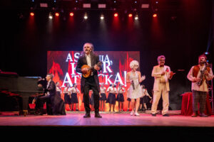 Com humor refinado, músicas cativantes e uma narrativa única, “A Sbørnia Kontr’Atracka” promete encantar tanto os fãs de longa data quanto novos espectadores. No show, Kraunus (Hique Gomez) e Nabiha (Simone Rasslan) apresentam as canções e causos sbørnianos junto a seus convidados especiais: o Professor Ubaldo Kanflutz (Cláudio Levitan), reitor das Universidades de Ciências Fictícias da Sbørnia, MenThales (Tales Melati), o tocador de gaita-foles e hipnotizador das montanhas da Kashkadúnia, Pierrot Lunaire (Gabriella Castro) a grande sapateadora do Ballet Hiperbølico da Sbørnia e o “Stela Maritmus Sborniani”, as Estrelas do Mar Sbørniano, uma seleção de 12 vozes do Jungst Korhal Sbøniani. Um show de luzes e projeções especiais promovem uma imersão ao universo sborniano.