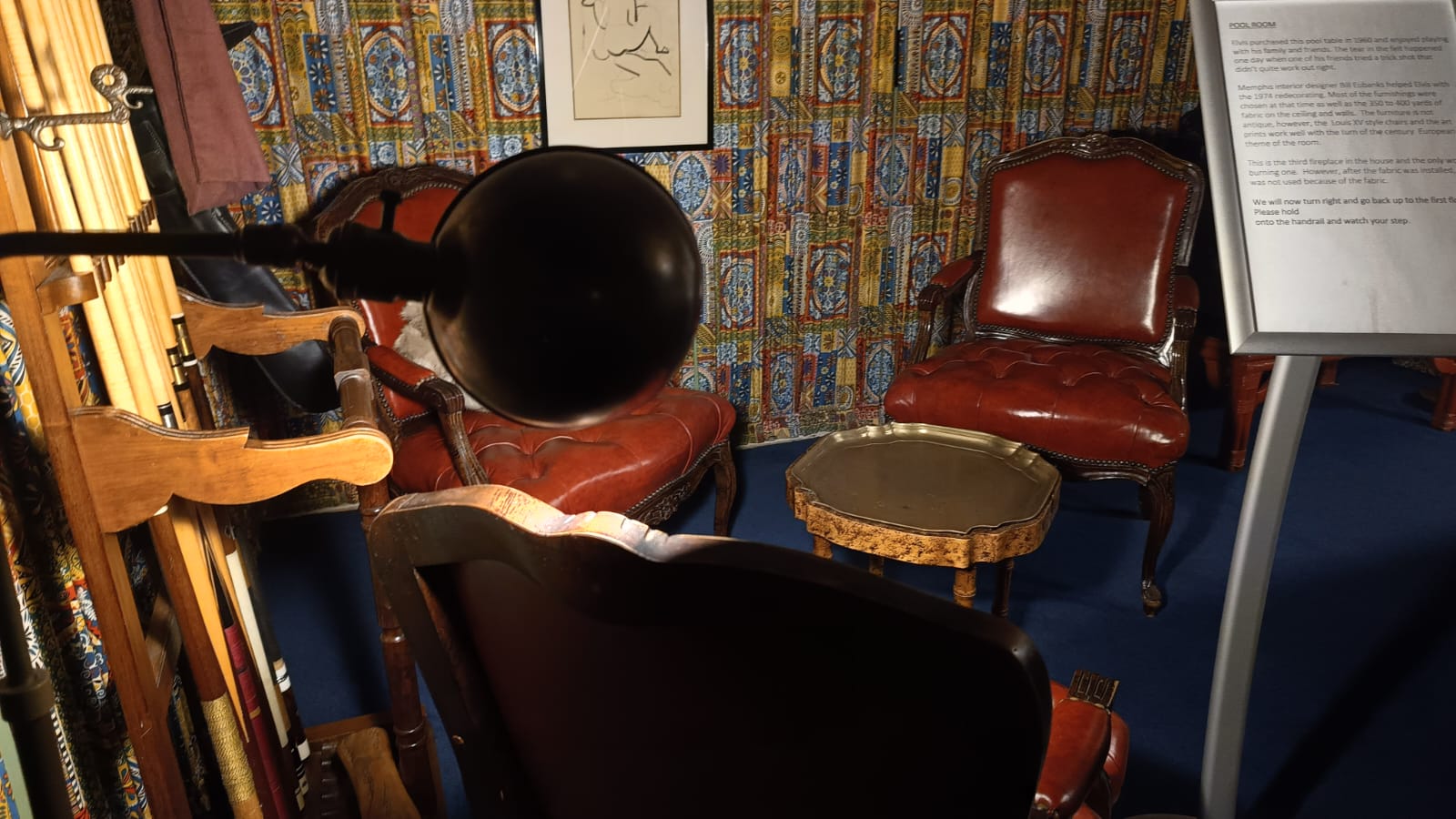 Um dos espaços mais impactantes para mim foi a chamada “Jungle Room” (Sala da Selva), com móveis exóticos, carpetes verdes e uma atmosfera única que misturava kitsch e conforto. Outro destaque é a Sala Amarela, onde Elvis costumava ouvir música, receber visitas e assistir a três televisões ao mesmo tempo — um luxo visionário para a época. A sala de jogos, vibrante e cheia de cor, revela o gosto de Elvis por ambientes alegres e criativos.