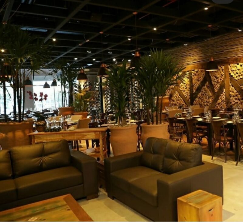 No entorno, a presença de elementos como pedras e madeiras. Uma parede decorada com tijolos, traz divisões de madeiras que criam formas, dando ares modernos. As folhagens em vasos crus de argila denotam a preocupação de trazer a biofilia, para dentro do local. A iluminação intimista e direta garante charme ao espaço. Mesas e cadeiras espalhadas em tons escuros de madeira, ampliam a visão do todo, garantindo a experiência estética.