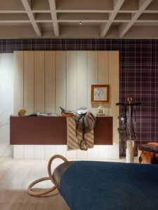Entre os elementos de destaque, uma sela de cavalo ganha protagonismo ao ser acomodada sobre um aparador bar desenhado especialmente para a mostra. A peça, carregada de memória e significado, estabelece o eixo conceitual do ambiente: o encontro entre tradição e contemporaneidade, força e delicadeza, movimento e acolhimento.