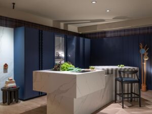 A aposta nas cores intensas, listrados e xadrezes revela uma tendência que combina ousadia estética com aconchego. Os visitantes poderão observar na cozinha o contraste entre azul-marinho na parte externa e ametista na parte interna, um convite à interação visual que transforma o ato de cozinhar em experiência sensorial e criativa.